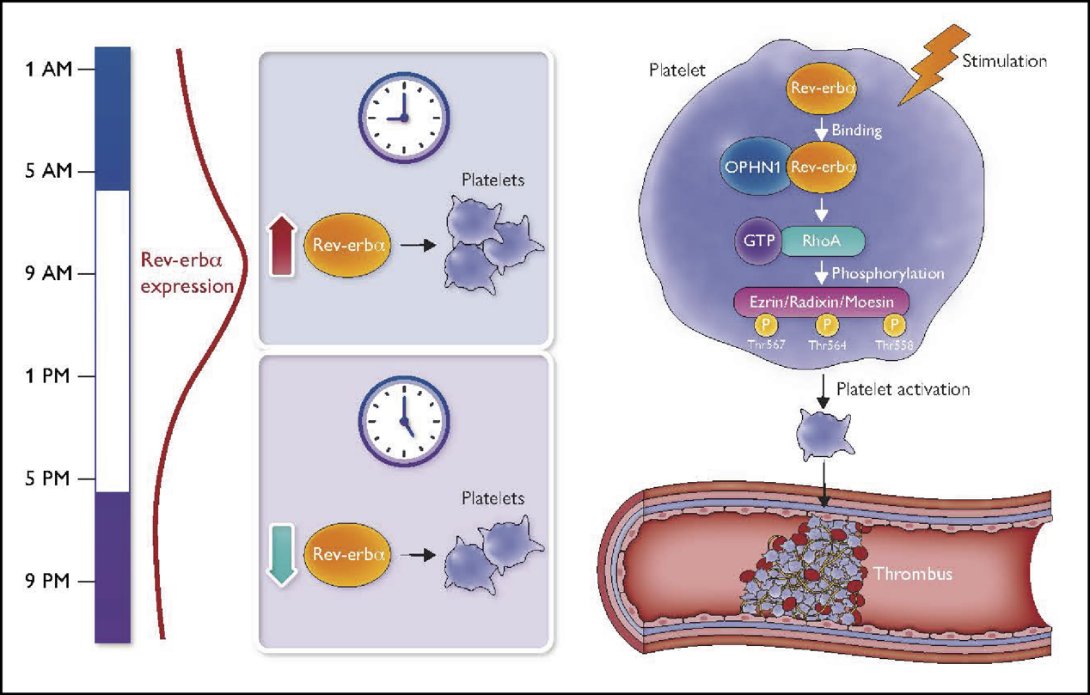 研究者在临床研究中发现,人体血小板聚集和血栓形成具有晨峰现象。健康人体血小板中存在一种特殊的、呈现昼夜震荡的生物钟核受体Rev-erbα,驱动了人类血小板聚集和血栓形成的晨峰现象。生物钟核受体活化在高凝患者的血小板中具有昼夜震荡,在血栓形成中发挥关键作用。