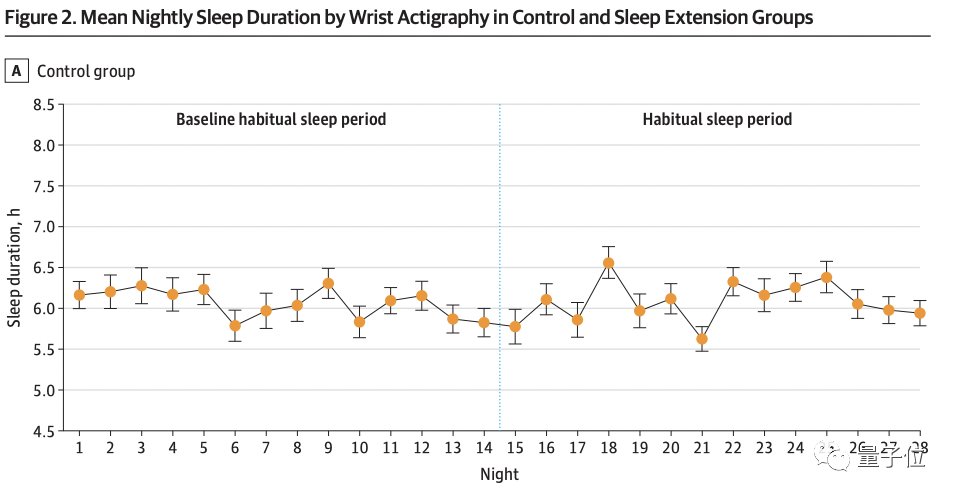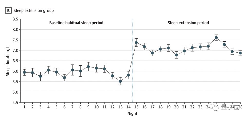 2周之后,研究团队开始对延长睡眠组进行干预,通过专门的睡眠咨询和建议,将延长组的睡眠时长从不足6.5小时提升到7-8小时之间。